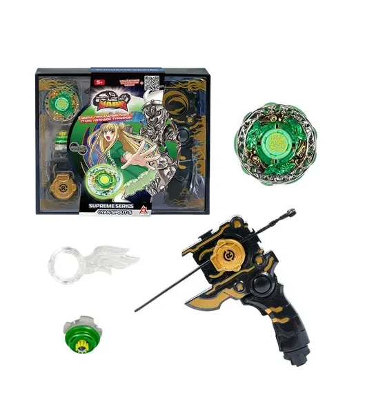 В комплект входят: волчок, пусковая установка с рукояткой, лента для запуска, сменный наконечник, монтажный инструмент, инструкция. Упаковка — коробка с окном 26×7×22 см.