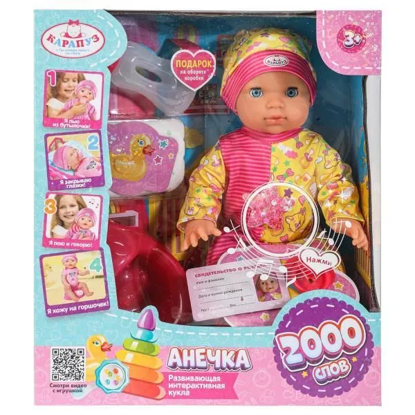 Этот милый пупс, с детально проработанным личиком, обязательно понравится вашей малышке. Анечка одета в яркий костюмчик с принтом и шапочку в тон. Одежда легко надевается и снимается. С Анечкой девочка может играть в самые разные игры, гулять с ним, петь песни, кормить, переодевать, рассказывать сказки и укладывать спать.